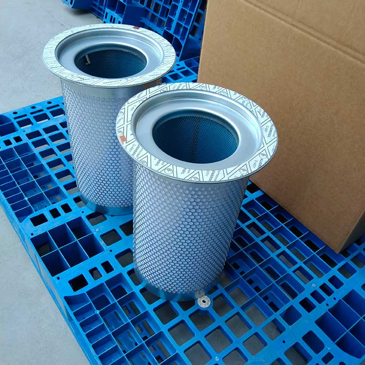 油氣分離元件是決定空壓機壓縮空氣品質的關鍵部件,高質量的油氣分離元件不僅可保證壓縮機的高效率工作,且濾芯壽命可達數千小時。從壓縮機頭出來的壓縮空氣夾帶大大小小的油滴,大油滴通過油氣分離罐時易分離,而小油滴(直徑1μm以下懸浮油微粒)則必須通過油氣分離濾芯的微米級玻纖濾料層過濾。油微粒經過濾材的擴散作用,直接被濾材攔截以及慣性碰撞凝聚等機理使壓縮空氣中的懸浮油微粒很快凝聚成大油滴,在重力作用下油凝聚在油分芯底部,通過底部凹處回油管進口返回機頭潤滑油系統,從而使壓縮機排出更加純凈無油的壓縮空氣。壓縮空氣中的固體粒子經過油分芯時滯留在過濾層中,這就導致了油分芯壓差(阻力)不斷增加。隨著油分芯使用時間增長,當油分芯壓差達到0.08到0.1Mpa時,或者壓縮空氣出口產生明顯的含油量時,濾芯必須更換,否則增加壓縮機運行成本(耗電或耗油)。